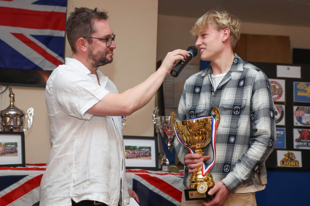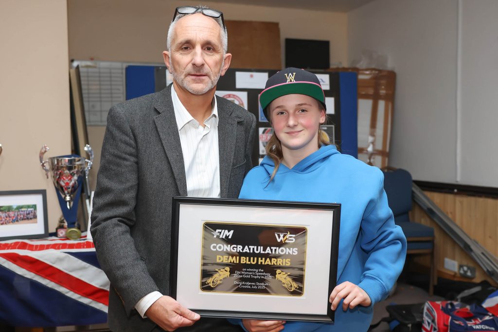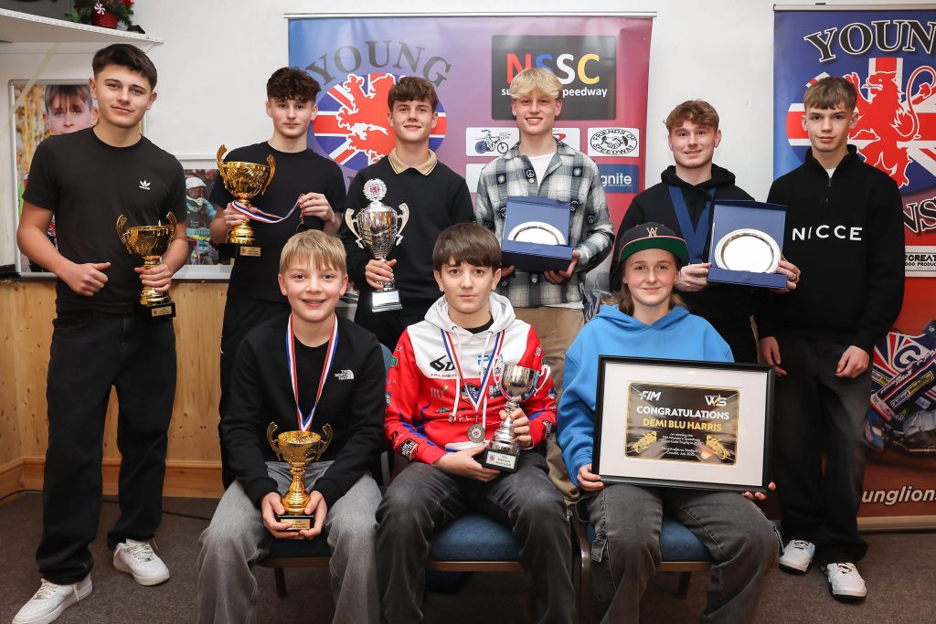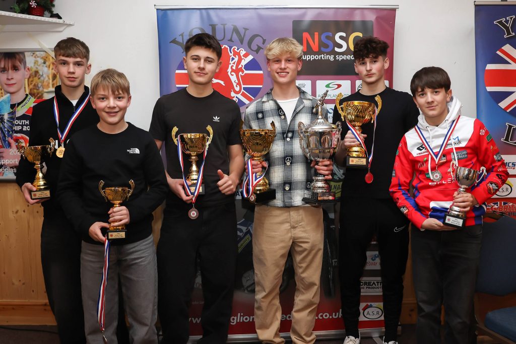 Charlie Southwick (3rd in 500cc), Ryan Ingram (2nd in 500cc), Luke Harrison (U19 Champ), Cooper Rushen (500cc Champ), Sam Hagon (U21 Champ), Oliver Bodingdon (2nd in 250cc), Sitting, Archie Rolph (3rd 250cc), Fraser Buckle (2nd in 125cc), Demi Buy Harris (FIM Woman’s 250cc Gold Trophy)